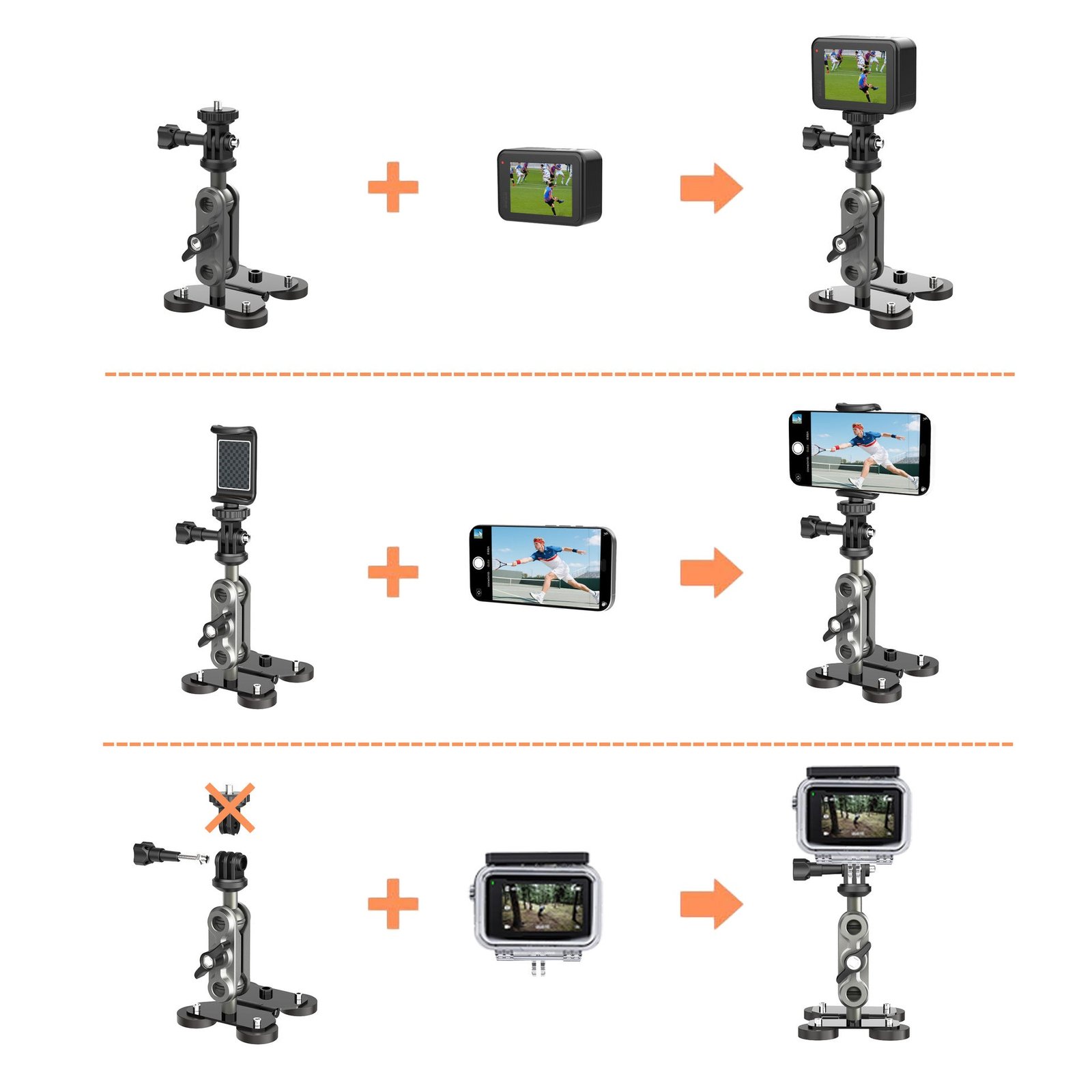 Dual Mounting Points & Versatile Use- The camera fence mount features a dual mounting point design: one side supports the included magic arm and action camera adapter for game highlights, while the other is equipped with a 1/4′ screw hole with locating holes for extra magic arms, phone clamps or other devices, enabling dual position shooting, or for a mobile power to charge your action camera (using the phone clamp), ensuring extended recording throughout the event